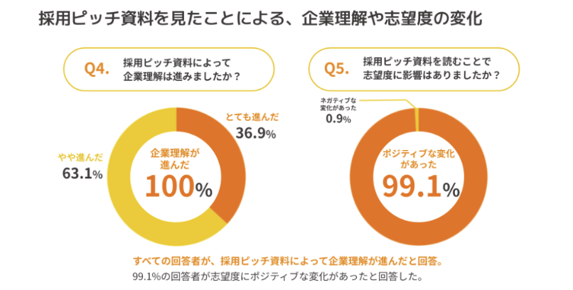 実際に、マルゴト株式会社が実施した「採用ピッチ資料に関する意識調査」によると、「採用ピッチ資料を見たことによる、企業理解や志望度の変化」について問う設問では、99.1%の回答者が「志望度にポジティブな変化があった」と回答しています。