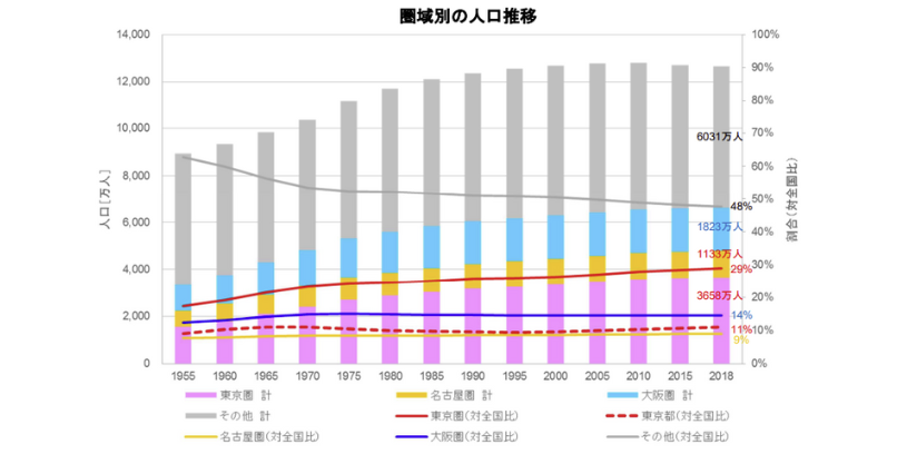国土交通省「東京一極集中の是正方策について」によると、東京圏・名古屋圏・大阪圏の三大都市圏へ人口が集中していることが明らかになりました。特に顕著なのが、東京圏の増加です。一方、三大都市圏以外の地方圏が占める人口の割合は年々減少しています。