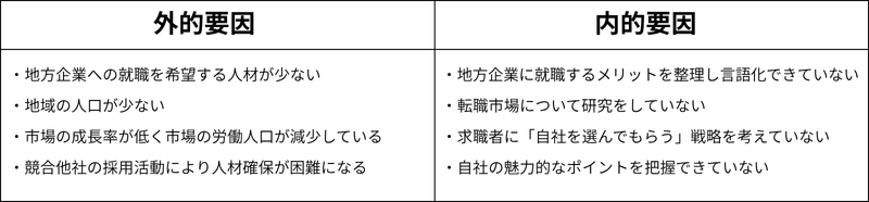 採用課題には外的要因と内的要因があります。外的要因は自分たちでは変えられないものであり、そこに注力しても意味はありません。採用成功につなげるためには、内的要因で考えることが重要です。