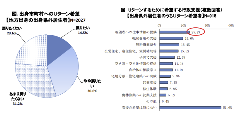 この結果からは、地方企業への就職希望者は少なくないことがわかります。しかし、Uターン希望者が行政に求める支援として「仕事情報の提供」が最も多く挙げられており、情報不足が行動の障壁となっていることが明らかになっています。