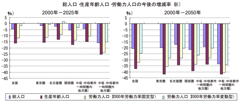 国土交通省「地方における人口・労働力の変化」によると、少子高齢化の影響で生産年齢人口が減少し、地方の労働人口は2020年から2050年までに約40%減少すると試算されました。