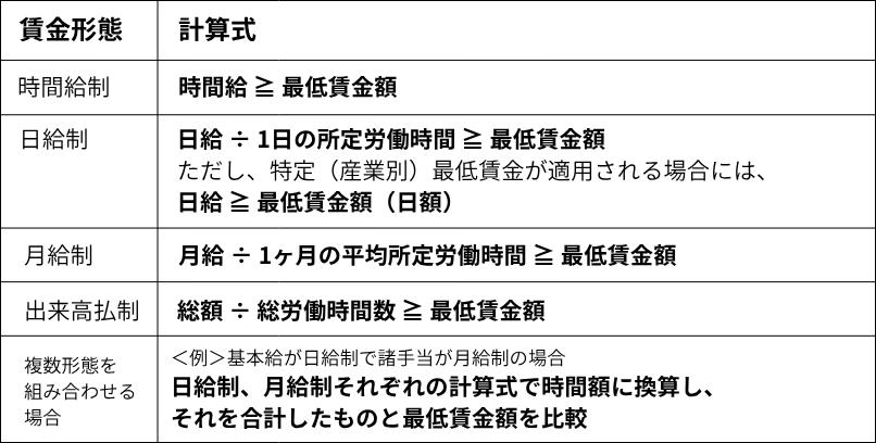 最低賃金の計算方法は、労働契約の形態によって異なります。最低賃金は「時間額」で定められているため、時給制以外の賃金形態(日給制、月給制、出来高払制など)の場合でも、1時間当たりの賃金に換算して、その金額が最低賃金以上であるかを確認する必要があります。