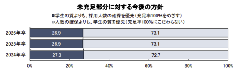 キャリタスが実施した調査によると、未充足部分に対する今後の方針については、73.1%の企業が「人数の確保よりも学生の質を優先」と回答しています。