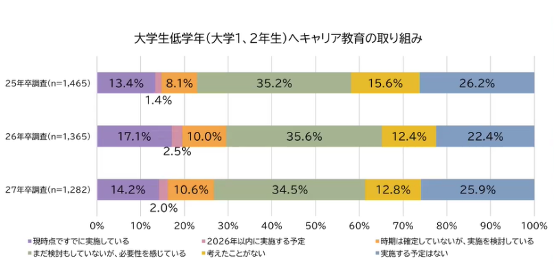 27卒採用のさらに先を見据え、大学1・2年生を対象としたキャリア教育に乗り出す企業が急増しています。 同調査では、「すでに実施している」または「2026年以内に実施予定」「実施を検討している」企業が半数近くに達しており、採用ブランディングの戦場は低学年層へと広がっています。
