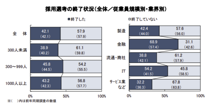 キャリタス就活の「新卒採用に関する企業調査(2025年10月調査)」によれば、26年3月卒業予定者の採用選考を「終了した」企業は42.1%にとどまり、4年連続で半数を下回る結果となりました。