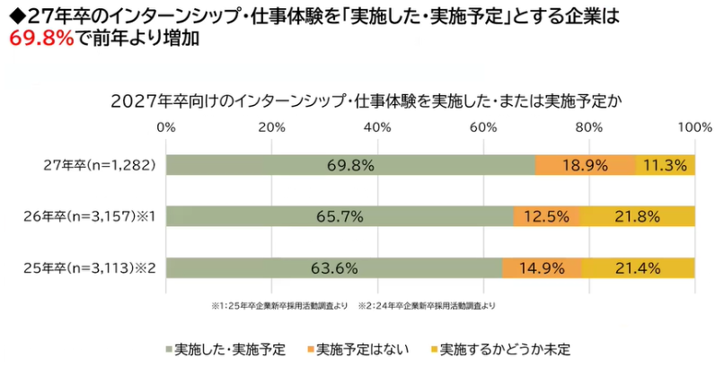 株式会社マイナビが実施した「インターンシップ・キャリア形成支援活動に関する企業調査」によると、27卒向けのインターンシップ・仕事体験を「実施した・実施予定」と回答した企業は前年を上回る69.8%に達し、採用意欲は依然として高水準にあります。