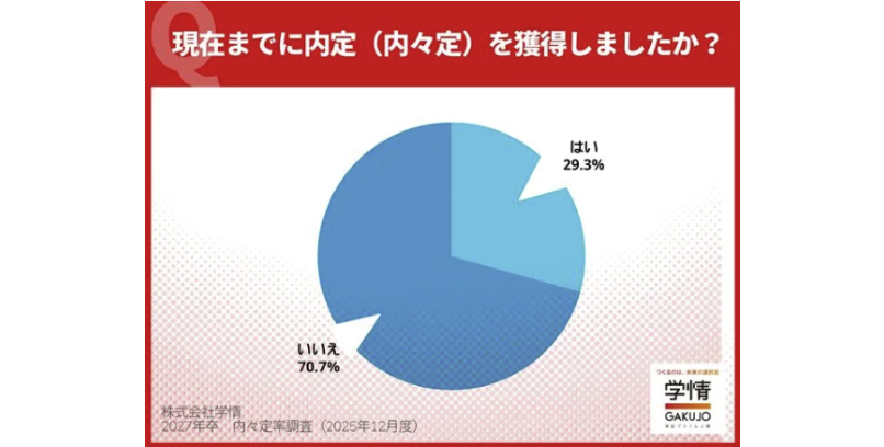 株式会社学情が2025年12月に実施した「内々定の獲得状況に関するアンケート調査」では、27卒学生の11月末時点での内々定率が29.3%と過去最高水準に達しており、学生優位の市場構造が続いていることが確認されました。