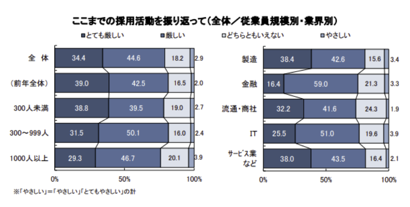 キャリタス就活の調査でも、約8割の企業が26卒採用を「厳しい」と振り返っており、特に製造業やサービス業など、充足率が低かった業界では「とても厳しい」との回答が目立ちました。